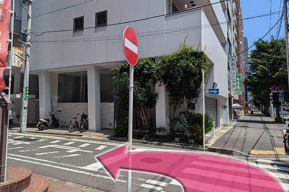 ⑥ファミリーマートにつきましたらファミリーマートを左手にして直進していただいて、すぐ左手に路地がございますので左折してください。