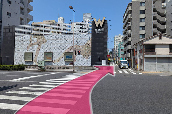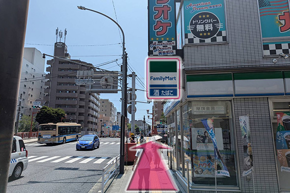 ⑤その後、はす向かいにファミリーマートが見えてきますので横断歩道を渡って ファミリーマートに向かってください。